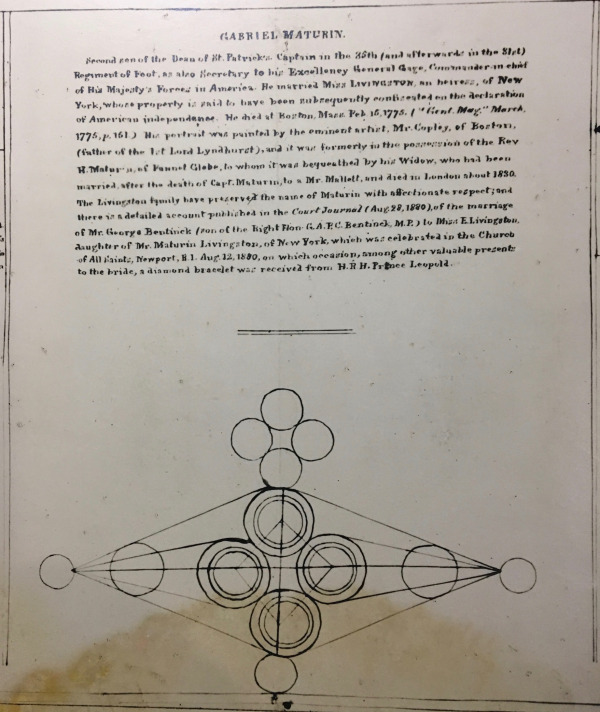 (1) The entry for 15 December 1774 in “Boyle’s Journal of Occurrences in Boston” gives Gabriel’s age at death to be 44; this confirms the information “b: ’30” supplied by John Houlding from his database of British Army officers. With thanks to Chris Bryant for the information. Rev. Edmund Maturin’s Pedigree 1880 details Gabriel James‘ appointments (family archive)
