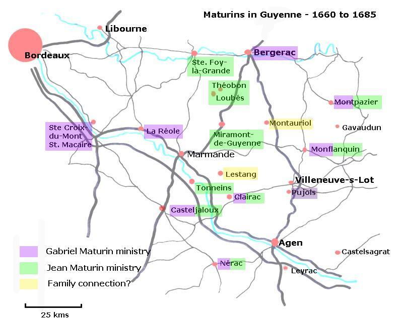The French region of Guyenne east of Bordeaux, particularly the Bastide Towns centered on Agen, was a cradle of Protestantism from the reign of Francois I (1515 to 1547). Marguerite of Angoulême, queen of Navarre, actively supported the establishment of centres for the "Reformed Church", first at Clairac and later at Nérac, giving refuge to Calvin on his road to Geneva. It seems likely that Gabriel was born in this region in about 1638 and that he and his brothers, Jean (born about 1639) and Jacob were baptised in the "RPR" (Religion Prétendue Réformée). Though "Mathurin Père" is referred to in notes on a Synod in 1637 (2) as the father of Gabriel and Jean he is given no first name and it cannot be inferred for certain that he was a minister. Tradition has it that the family came originally from Montauriol, 25 kms south of Bergerac.